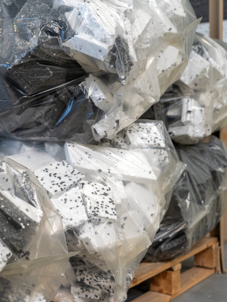 Aby bolo balenie tovaru čo najefektívnejšie, nakupujú sa hotové kusy polystyrénu, ako aj väčšie kusy, ktoré sú narezané na presné rozmery, aby sa prispôsobili konkrétnym výrobkom. Zvyšky polystyrénu, ktoré sa nedajú použiť na nič iné, sa posielajú späť výrobcovi, aby sa mohli recyklovať na nový polystyrén.