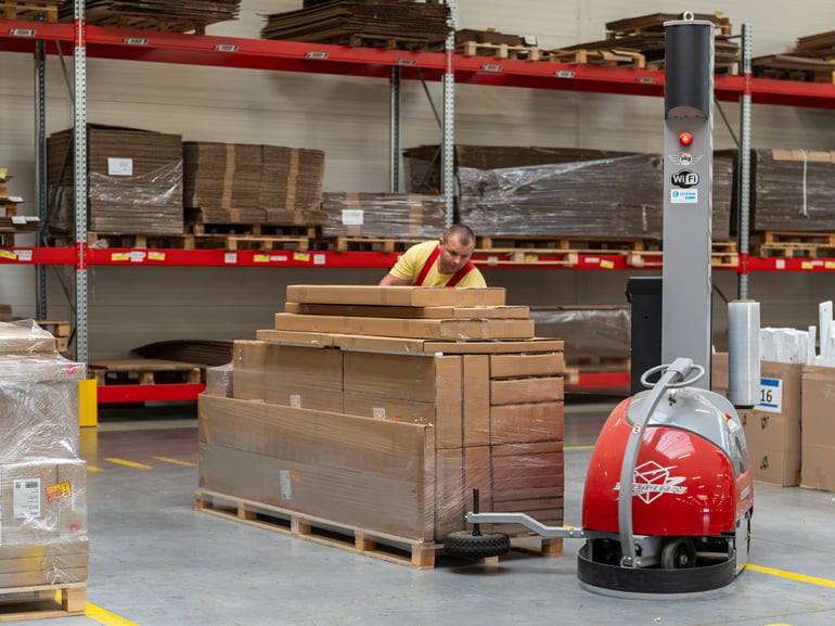 „Paleta balená strojom potrebuje menej fólie, pretože dokáže fóliu natiahnuť tesnejšie a kompaktnejšie okolo palety, čo má aj tú výhodu, že sa znižuje riziko poškodenia tovaru, takže nie je potrebné použiť toľko metrov fólie."