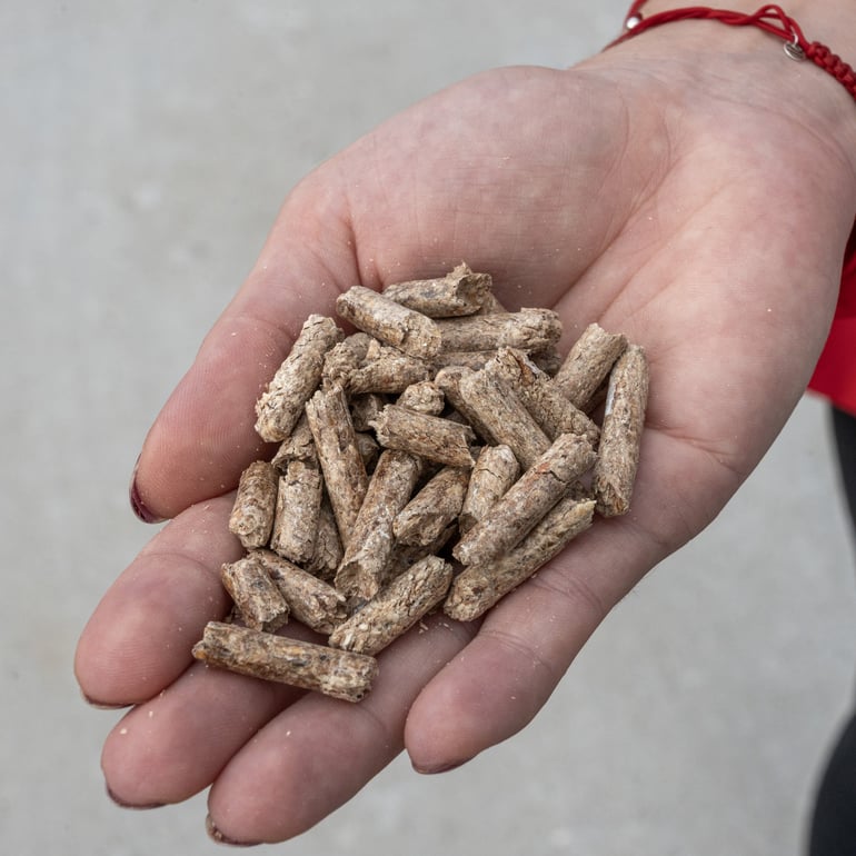 Hneď za rohom závodu, len kúsok od solárnych panelov, sa nachádza veľké silo spojené s budovou. Sem sa dostávajú piliny z výrobného procesu po rozdrvení zvyškov vrátane drevotrieskových dosiek. Zvyšky dosiek a dreva sa prepravujú na dopravníkovom páse do drviča na mieste v továrni, kde sa piliny stlačia na pelety a sú pripravené na spaľovanie.