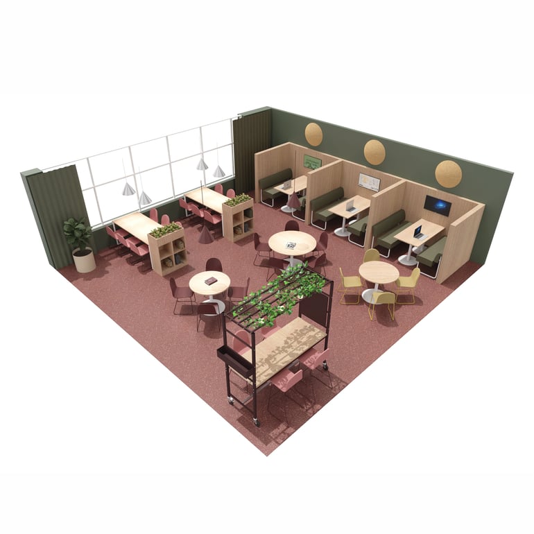 Viac ako len jedáleň – vďaka inšpiratívnym farbám, flexibilným prvkom a teplému, príťažlivému prostrediu sa mení na prirodzené miesto pre dialógy, kde sa rodia nové nápady. Skvelo poslúži pri spontánnych prestávkach aj pri workshopoch či brainstormingoch.