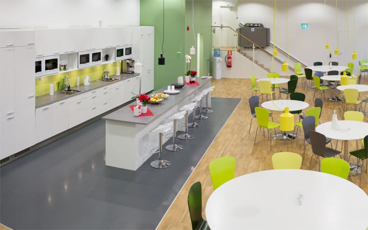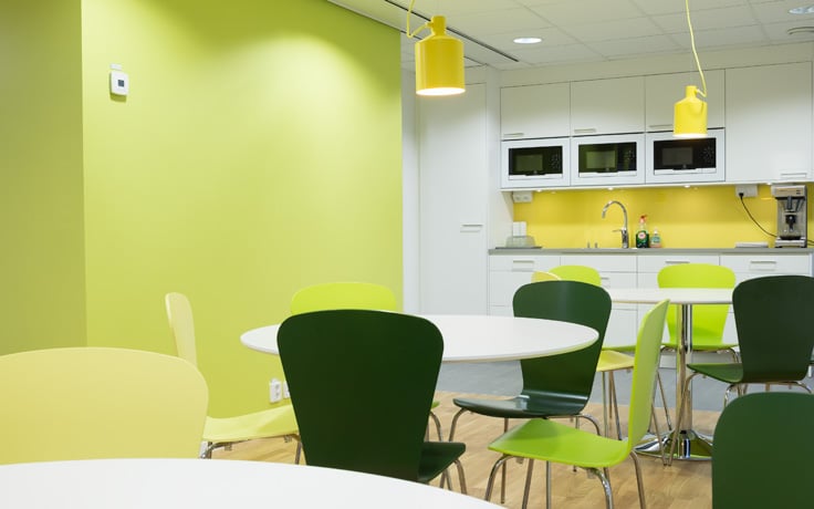 Malin nám prezradila, že jej obľúbenou súčasťou nového pracoviska je veľká jedáleň. Je priestranná s vysokými stropmi a veľkými bielymi stolmi obklopenými modernými stoličkami v zelených a žltých odtieňoch. Veľa nábytku v priestoroch spoločnosti sme zámerne vybrali v podobnej farebnej schéme na vytvorenie jednotného vzhľadu.